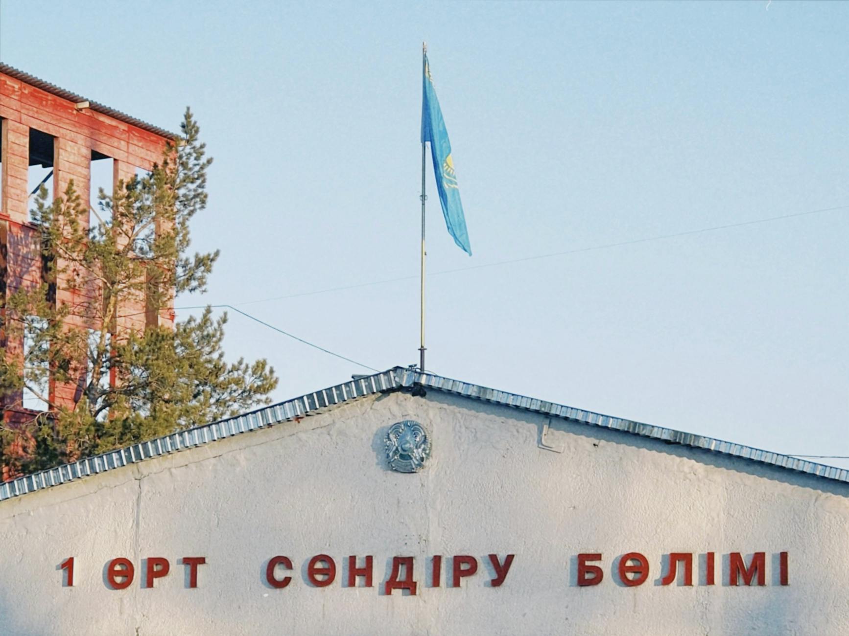 Fire station building in Konaev, Kazakhstan with the national flag on pole against a blue sky.